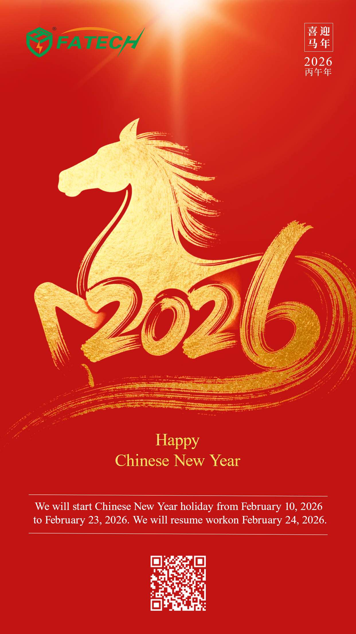 As the 2026 Chinese Spring Festival approaches, we would first like to express our sincere gratitude for your generous support and pleasant cooperation with our company throughout 2025. All staff of FATECH ELECTRONIC send you our early Spring Festival greetings. To ensure the smooth implementation of cooperation matters, orders and contracts during the Spring Festival holiday, we hereby notify you of the following arrangements: